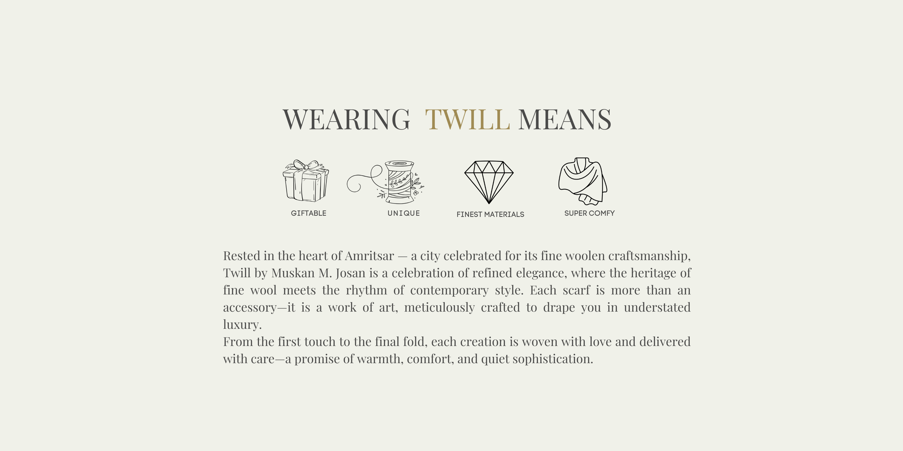 Rested in the heart of Amritsar — a city celebrated for its fine woolen craftsmanship, Twill by Muskan M. Josan is a celebration of refined elegance, where the heritage of fine wool meets the rhythm of contemporary style. Each scarf is more than an accessory—it is a work of art, meticulously crafted to drape you in understated luxury.